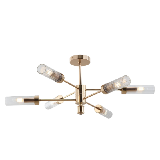 Изработено за современи ентериери, светло-светло со злато со злато со силно осветлување од 6 сенка, прикажува шест тенки, ребрести замрзнати стаклени нијанси кои создаваат мек сјај без сјај. Вертикалните стаклени цевки ја зголемуваат дисперзијата на светлината, правејќи просториите да се чувствуваат посветли и попривлечни. Францускиот електроплетирана златна завршница додава допир на луксуз додека се спротивставува на оцрнување, обезбедувајќи долготрајна брилијантност.
