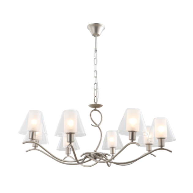 Овој 8-лесен двоен стаклен лустер со сатенски никел финиш го прикажува хармоничен спој на форма и функција. Конусни надворешни стаклени нијанси создаваат впечатлива геометриска силуета, додека замрзнатите внатрешни цилиндри го омекнуваат излезот на светлината, елиминирајќи го сјајот. Завршувањето на никелот со сатен песок додава пригушена метална сјај, надополнувајќи ги и неутралните и смелите шеми на бои. Нежните криви во разгранети раце го подобруваат визуелниот проток, што го прави фокусна точка во современите ентериери.