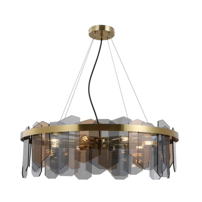 Силното осветлување има ново лансирано високо ниво со дијаметар од 68 см со двојна боја стаклен месинг, финиш, приврзок светло, специјално дизајнирана за хотел, вила, фарма и станбени простории. Светлината со финиш со финиш со двојна боја на стаклена боја има имитација на метална рамка во боја на бакар, спарена со стаклени парчиња со двојна боја, и е опремена со функција за прилагодување на висина преку четири челични кабли за да ги задоволи потребите на различни тавански височини.